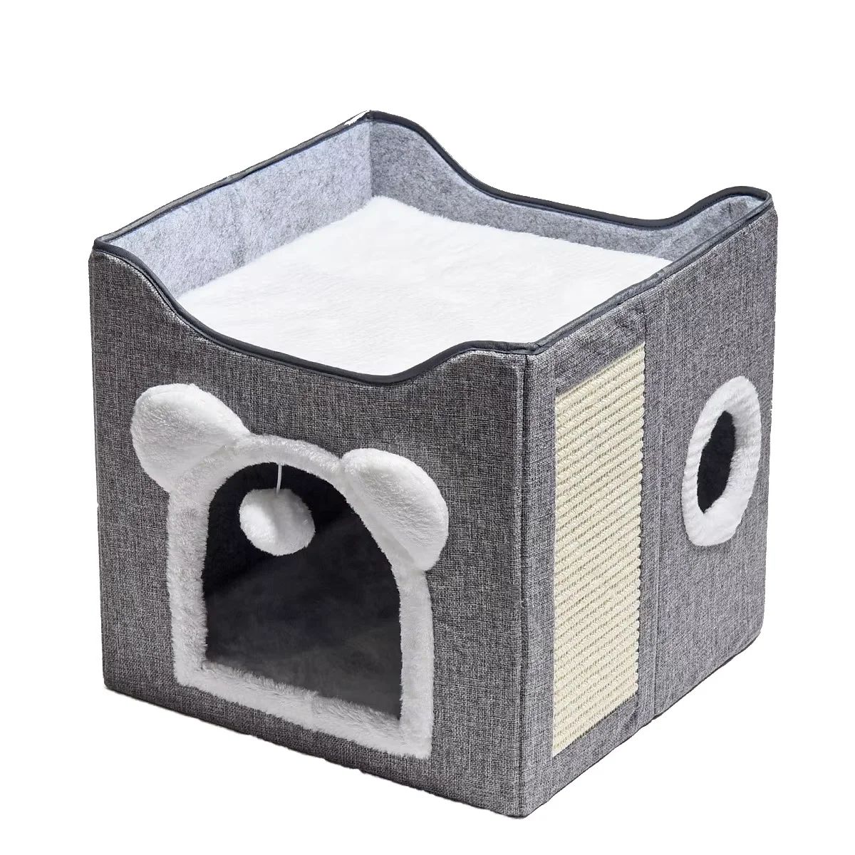 بيت قطط عملي يجمع بين مكان نوم مريح، منصة علوية للجلوس، وخداشة جانبية في قطعة واحدة موفّرة للمساحة.