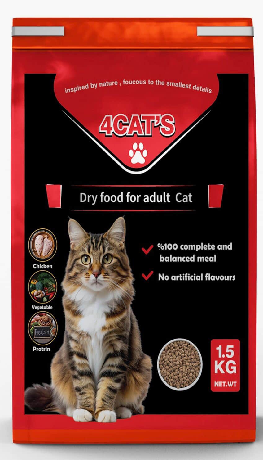 مستخلص حبوب الذرة والقمح المختار بعناية، والأرز البني، وأرز البيرة، وغلوتين القمح، مع مستخلص فول الصويا وأنقى الزيوت النباتية، وذلك بإضافة أفضل أنواع النكهات الطبيعية المختلفة مع أفضل قطع الدجاج أو السلمون أو اللحم البقري التي تحتوي على أعلى نسبة من البروتين وإضافة الخضراوات المعقمة اللازمة للنمو الكامل وزيادة الطاقة، بالإضافة إلى المعادن والفيتامينات والأحماض الأمينية اللازمة للنمو