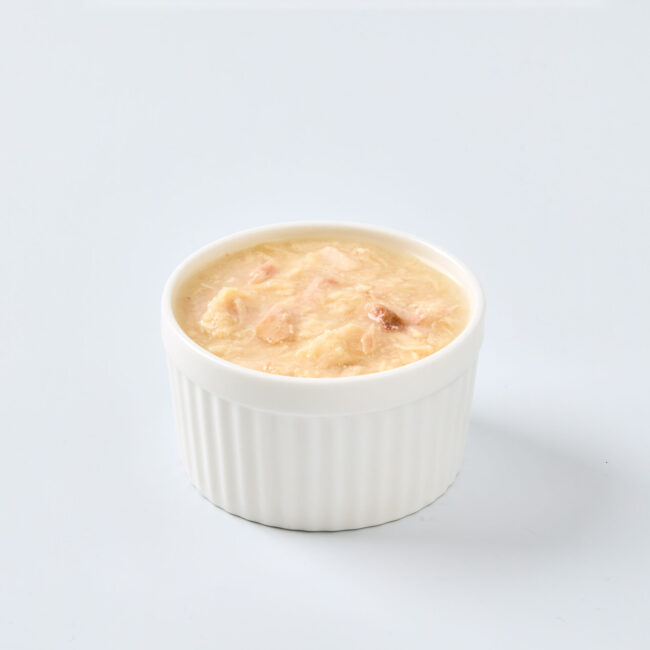 لحم الدجاج ، لحم التونة ، نشا التابيوكا المعدل ، الفيتامينات ، المعادن ، فركتوليغوسكاريد (FOS) ، اليوكا ، مستخلص الخميرة ، مسحوق صفار البيض ، كلوريد الكولين ، التورين ، زيت الكريل ، فيتامين ه ، زيت جوز الهند (MCTs)